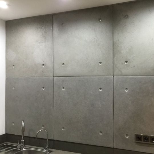 Для молодой семьи дизайнеров и архитекторов по дизайн-проекту Юлии Стариковой, компания ГЕОБЕТОН произвела бетонные настенные панели с отверстиями под крепление, бетонную кухонную столешницу и плинтус для кухни в частной квартире в модном микрорайоне города Челябинска.